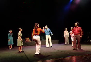 MUSIK menghentak dan suara choir berkostum hitam putih menggema ketika sorot lampu pelan-pelan menyibak kegelapan panggung. Menyusul tokoh Birawa memanggil satu persatu nama hingga terkumpul tujuh karakter. Mereka semua adalah karyawan perusahaan milik Den Karso. Kabar gembira disampaikan Birawa bahwa mereka semua mendapat kenaikan pangkat, kecuali Suli.