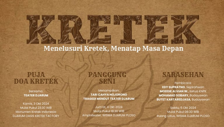 Teater Djarum mengagendakan kegiatan Puja Doa Kretek secara rutin setiap 3 Oktober, sejak tahun 2017. Sebuah kegiatan kebudayaan yang didedikasikan untuk kretek, yang berpuncak pada prosesi doa untuk keberlangsungan kretek bagi kesejahteraan masyarakat seluas-luasnya.